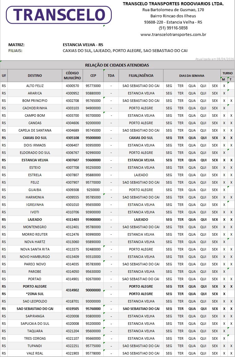 Menu Principal Transcelo Transportes Rodoviarios Ltda CNPJ 91.482.869/0001-75 I.E.: 042/0067299